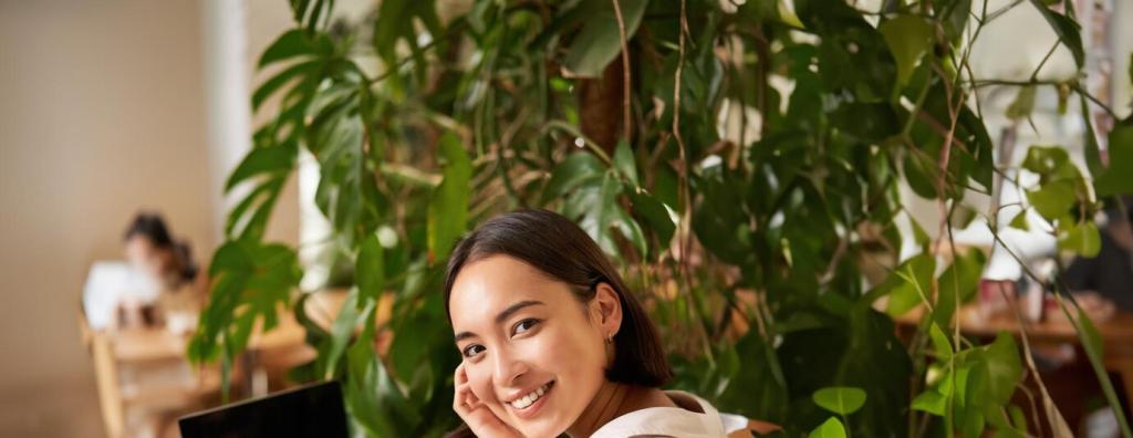 Setze niedrige Pflanzen seitlich des Monitors und höhere Ansichten hinter den Bildschirm. So bleiben Schultern entspannt, die Sicht frei, und dennoch rahmt Grün deinen Arbeitsplatz wie eine sanfte Kulisse.